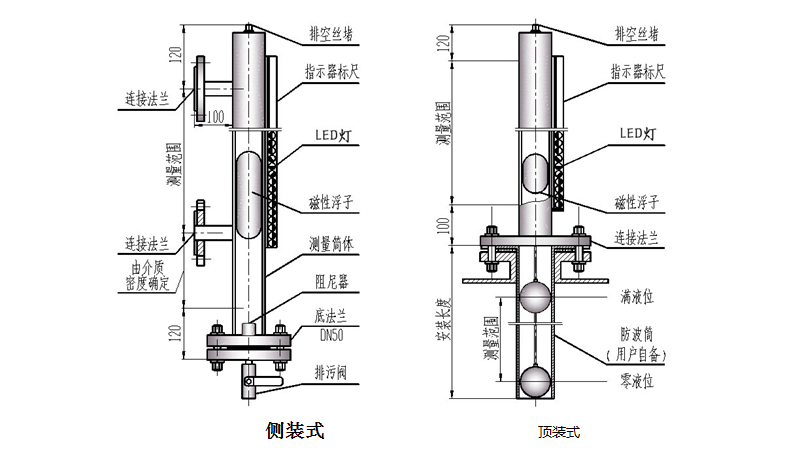 磁敏液位計有兩種安裝形式滿足用戶需求,包括:頂裝式、側裝式。